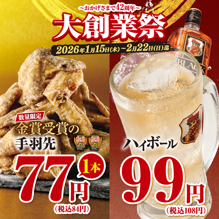 日頃のご愛顧への感謝を込めて、年に一度の「大創業祭」を開催します!! 開催期間:2026年1月15日(木)~2月22日(木) 🍺…